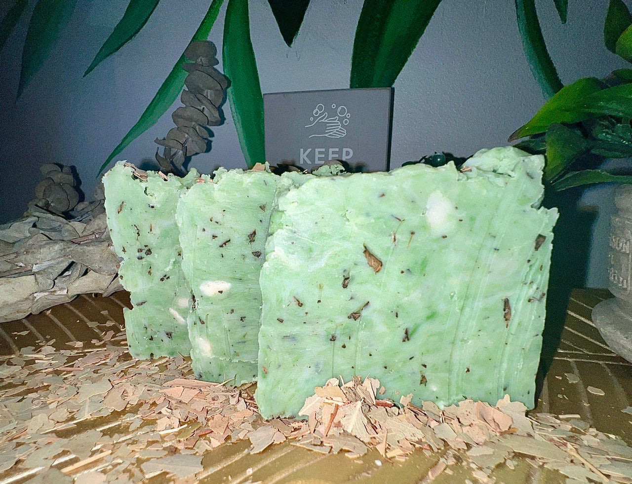 Elaborado en aceites saponificados de oliva, coco, almendras, ácido estearico, mentol, hojas de eucalipto para exfoleación y eceite esencial de eucalipto.